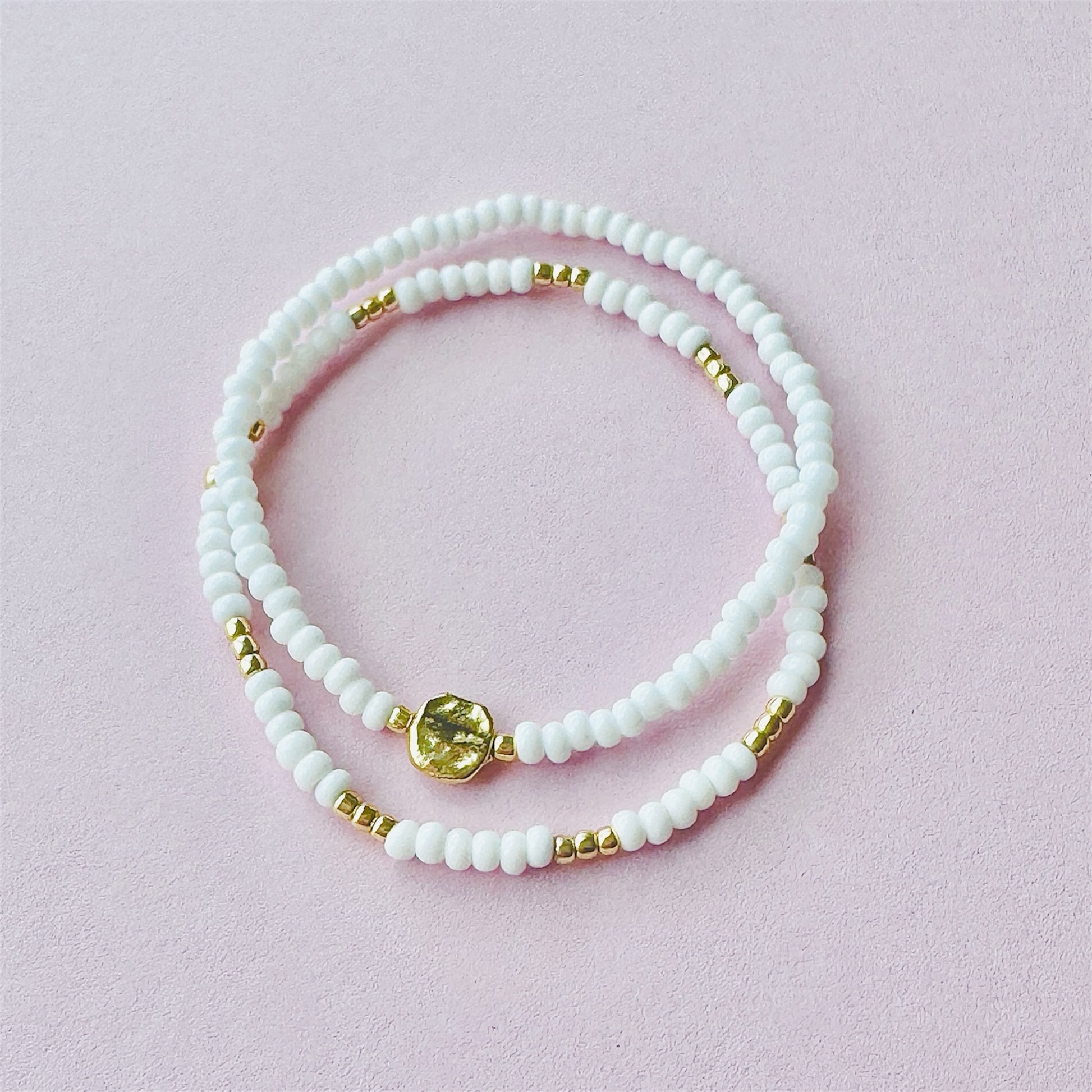 A set of two beaded bracelets featuring a 24K gold plated accent bead. The perfect accessory to add elegance and charm to any outfit.